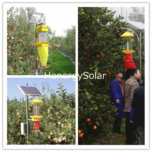 太陽能光伏防蟲害系統是利用太陽能電池板作為用電來源,其將白天太陽能發的電貯存起來,晚上放電給殺蟲燈具,供其工作。太陽能光伏防蟲害系統是利用365±50nm波長紫外光對昆蟲具有激備較強的趨光、趨波、趨色、趨性的特性原理,確定對昆蟲的誘導波長,研制專用光源,利用放電產生的低溫等離子體,紫外光輻射對害蟲間生的趨光興奮效應,引誘害蟲撲向燈的光源,光源外配置高壓擊殺網,殺死害蟲,使害蟲落下專用的接蟲袋內,達到滅殺害蟲的目的。