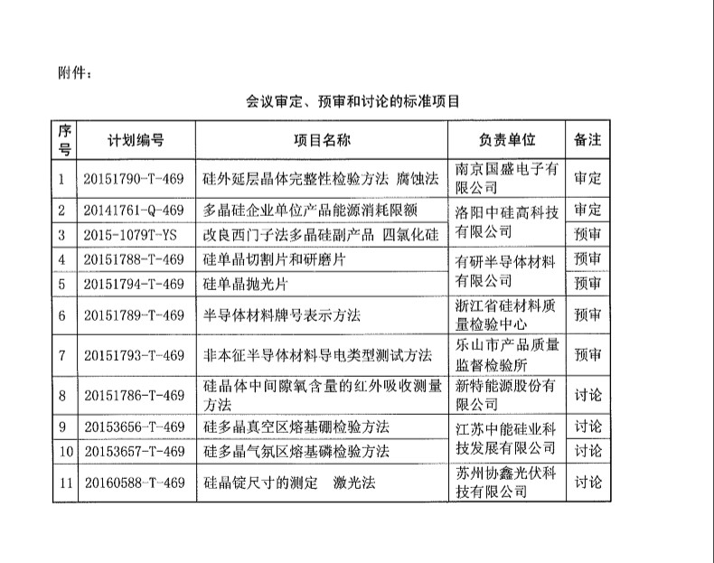 2016年9月7日半導體材料標準工作會議在新疆昌吉召開,會議將對《多晶硅企業單位產品能源消耗限額》等11項標準進行討論、預審、審定和任務落實。