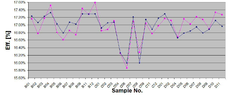 我們的少子壽命測試原理和傳統的微波光電導衰減(μ-PCD,Microwave Photoconductive Decay)原理不同,其在校驗后,將具有良好的相關性和一致性。切割畫線也具有良好的一致性。同樣的結果,NIR-PLUS2017顯示出高效的優勢。上圖顯示的最大的差異是在俄歇復合區域(Auger recombination dominated zones)。