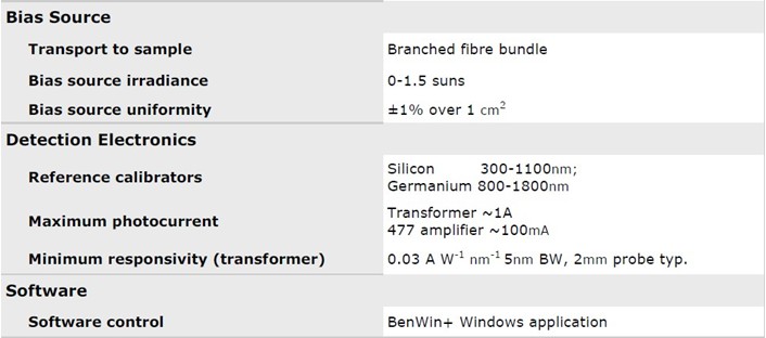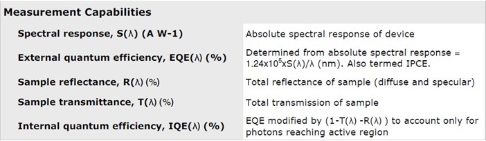 Flexible in use, and compatible with all types of photovoltaic devices, from silicon to 3rd generation devices, the PVE300 permits the quick and accurate determination of solar cell spectral response from which EQE (IPCE) can be determined, and, with the addition of determination of cell transmittance and reflectance, IQE, over a range up to 250-2.5μm.