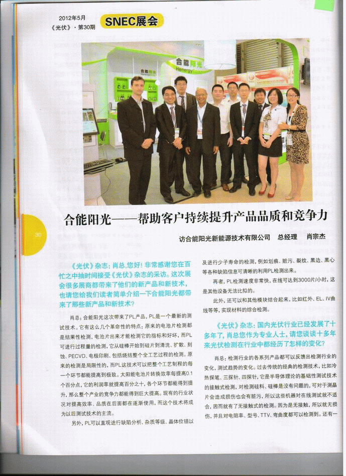 肖總:合能陽光這次帶來了PL產品,PL是一個最新的測試技術。它有這么幾個革命性的特點:原來的電池片檢測都是結果性檢測,電池片出來才能檢測它的指標和好壞,而PL可進行過程量的檢測,它從硅棒開始到硅片到清洗、擴散、刻蝕、PECVD、電極印刷、包括燒結整個全工藝過程的檢測。原來的檢測是局限性的,而PL這技術可以把整個工藝制程的每一個環節都能提高到極致。太陽能電池片轉換效率每提高0.1個百分點,它的利潤率就提高百分之十,各個環節都能得到提升,那么整個產業的競爭力都能得到巨大提高。現有的行業狀況對提高效率、品質在后面都在逐漸使用,而這個技術將成為以后測試技術的主流。